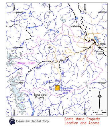 The Santa Maria property is located in central BC, 37 km south-southwest of Smithers. The property hosts base and precious metal mineralization in Eskay-type and aged rocks; however recent lithogeochemistry has determined that rocks do not have the Eskay-style signature. The Santa Maria has been explored by geological mapping, soil sampling, EM, SP, and IP surveys, trenching and 2600 m of diamond drilling in 21 holes, as well as minor historic underground exploration.